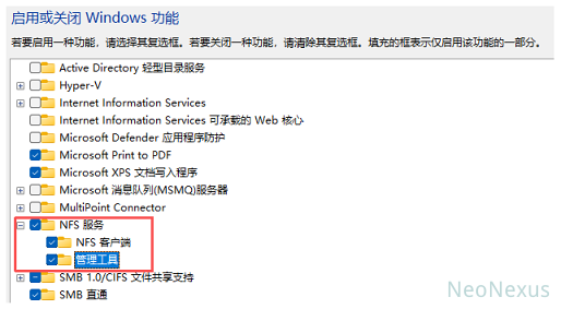 开启 windows 的 NFS 服务(如果是家庭版需要升级到专业版)