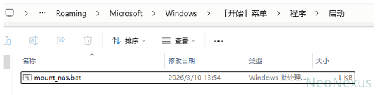 shell:startup,打开windows启动文件夹,将mount_nas.bat托进去,之后每次开机自动挂载