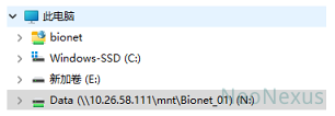mount_nas.txt文档,输入mount -o nolock 10.26.58.111:/mnt/Bionet_01/Data/bionet N: - 修改后缀为